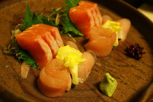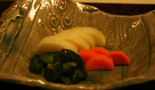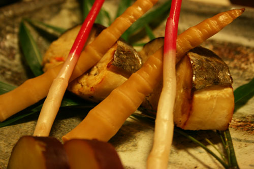 右から、甘エビの酒盗浸し、カラスミ大根、石垣零余子に